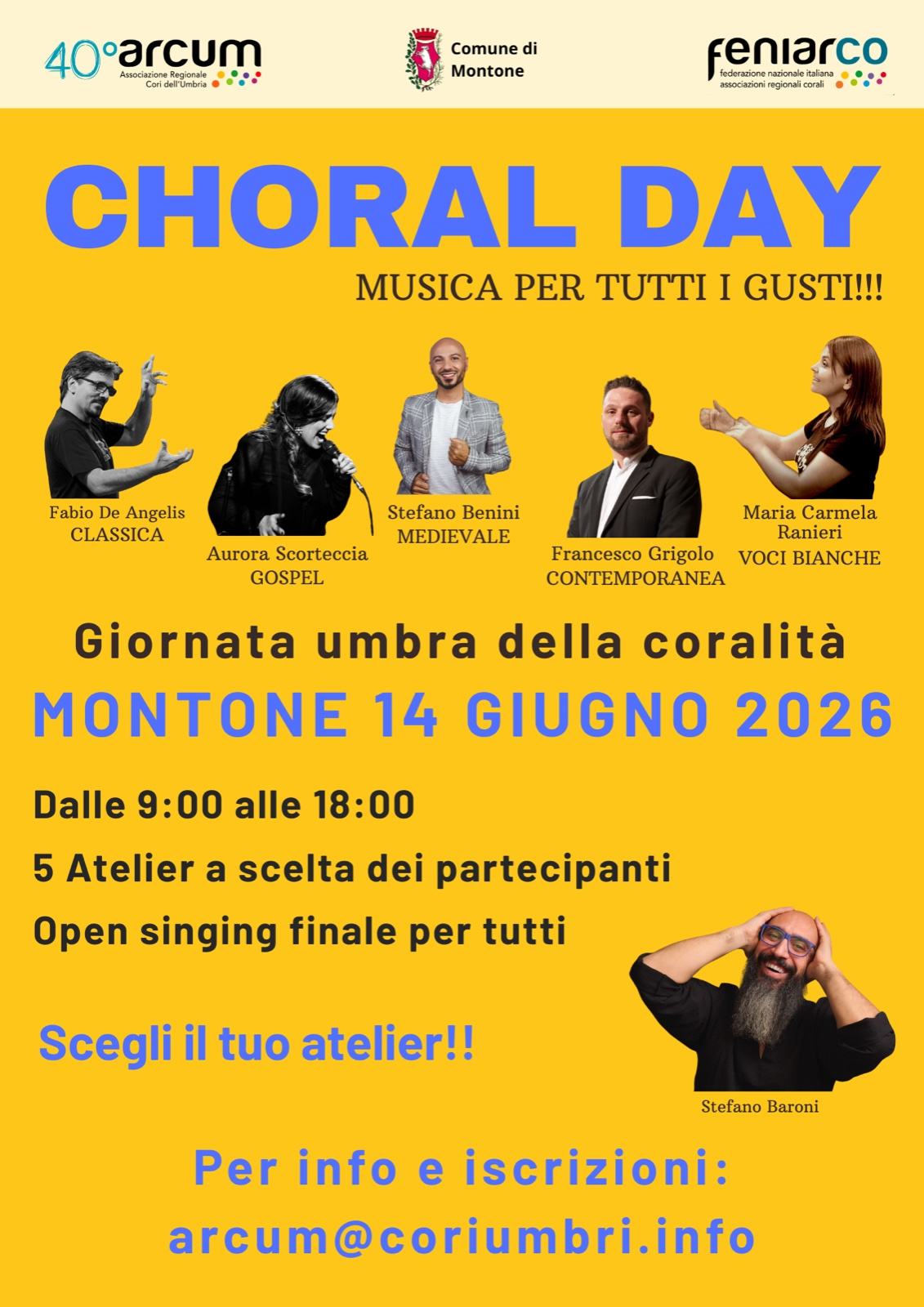 Il Choral Day, organizzato da ARCUM Associazione Regionale Cori dell'Umbria con il sostegno del Comune di Montone, è un’opportunità straordinaria per vivere insieme una giornata di musica, condivisione e allegria, immersi in un’atmosfera unica.