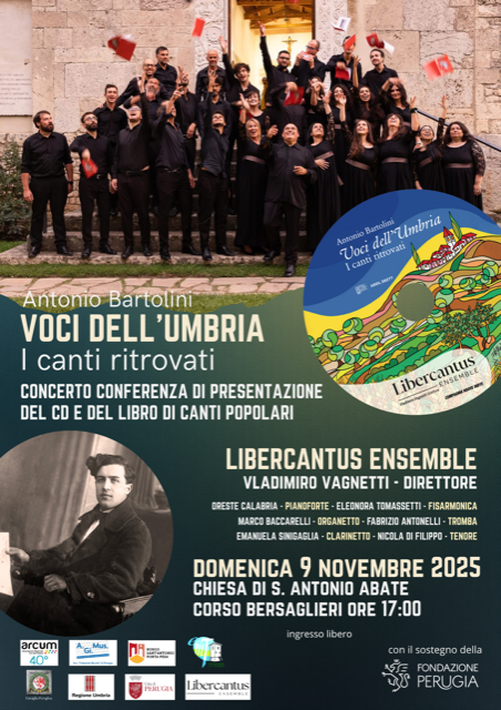 Nel  corso  dell’ incontro  verranno presentati il volume Voci dell’Umbria: i canti ritro-vati  (Joelle  Edizioni)  e il CD Voci dell’Umbria (Armel Music – CNI), frutto del progetto “Canti  dal  passato”, sostenuto dalla Fondazione Perugia e realizzato in partenariato con  ARCUM,  Famiglia  Perugina  ed  Ecomuseo  del fiume Tevere.La serata offrirà al pubblico  l’opportunità  di riscoprire il patrimonio della tradizione orale umbra attra-verso  l’esecuzione  dal  vivo  di  alcuni dei brani raccolti nel progetto, interpretati dal Libercantus  Ensemble  diretto  da  Vladimiro Vagnetti. Insieme alll'Ensemble si esibi-ranno  Oreste  Calabria  al  pianoforte,  Eleonora  Tomassetti alla fisarmonica, Marco Baccarelli  all’organetto,  Emanuela  Sinigaglia  al  clarinetto,  Fabrizio  Antonelli    alla tromba e il tenore Nicola Di Filippo.